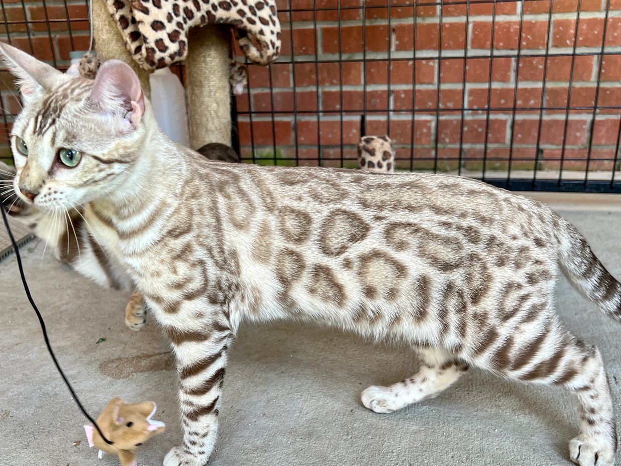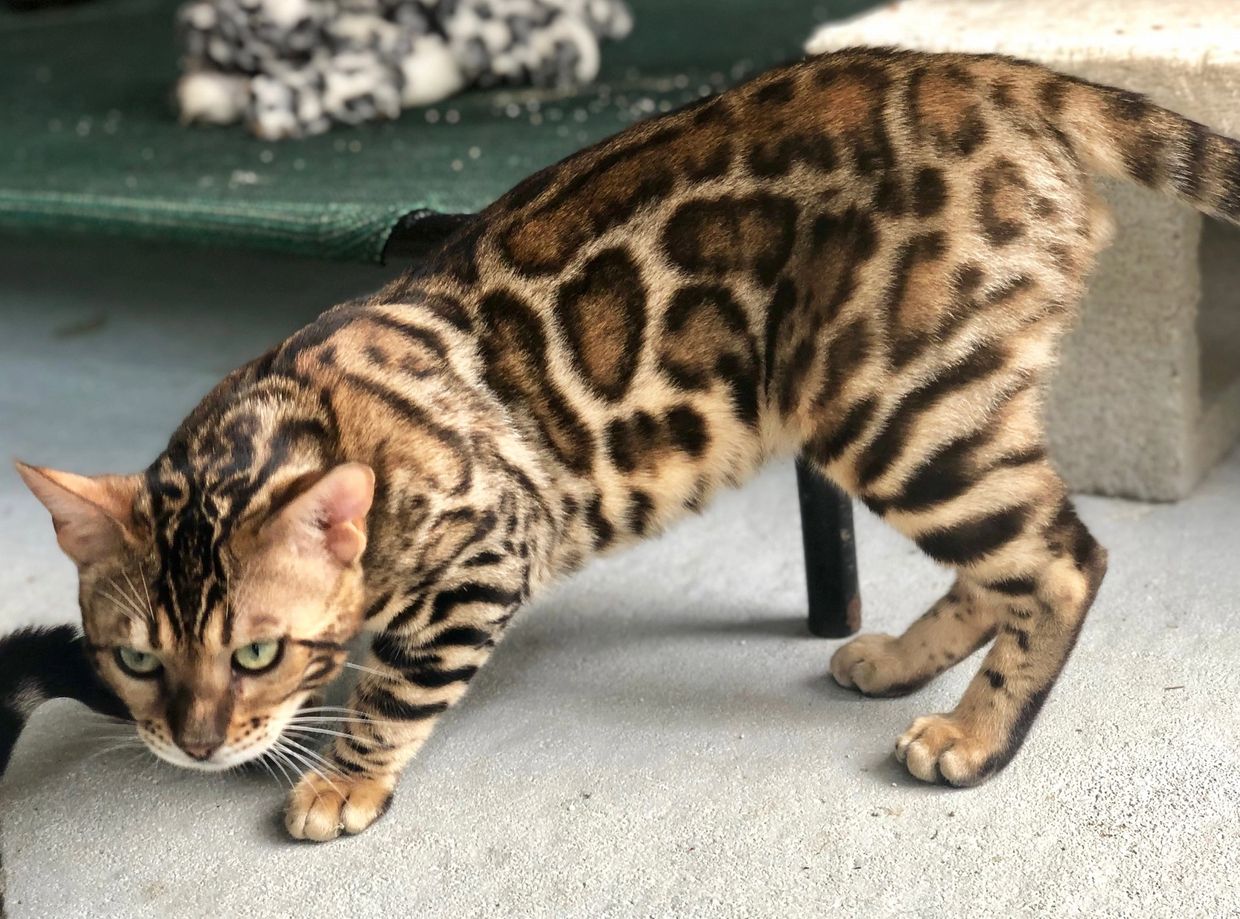 Our Bengal cat program is intimate yet exquisite. We have two studs and three ladies kept in two large outdoor pens as pairs during breeding. The queens deliver and raise their litters in the house. We specialize in brown, snow and dilute (blue) colors. ALL cats are TICA registered and full panel tested ad testing is located at the bottom of this page along with the kitten purchase agreement.